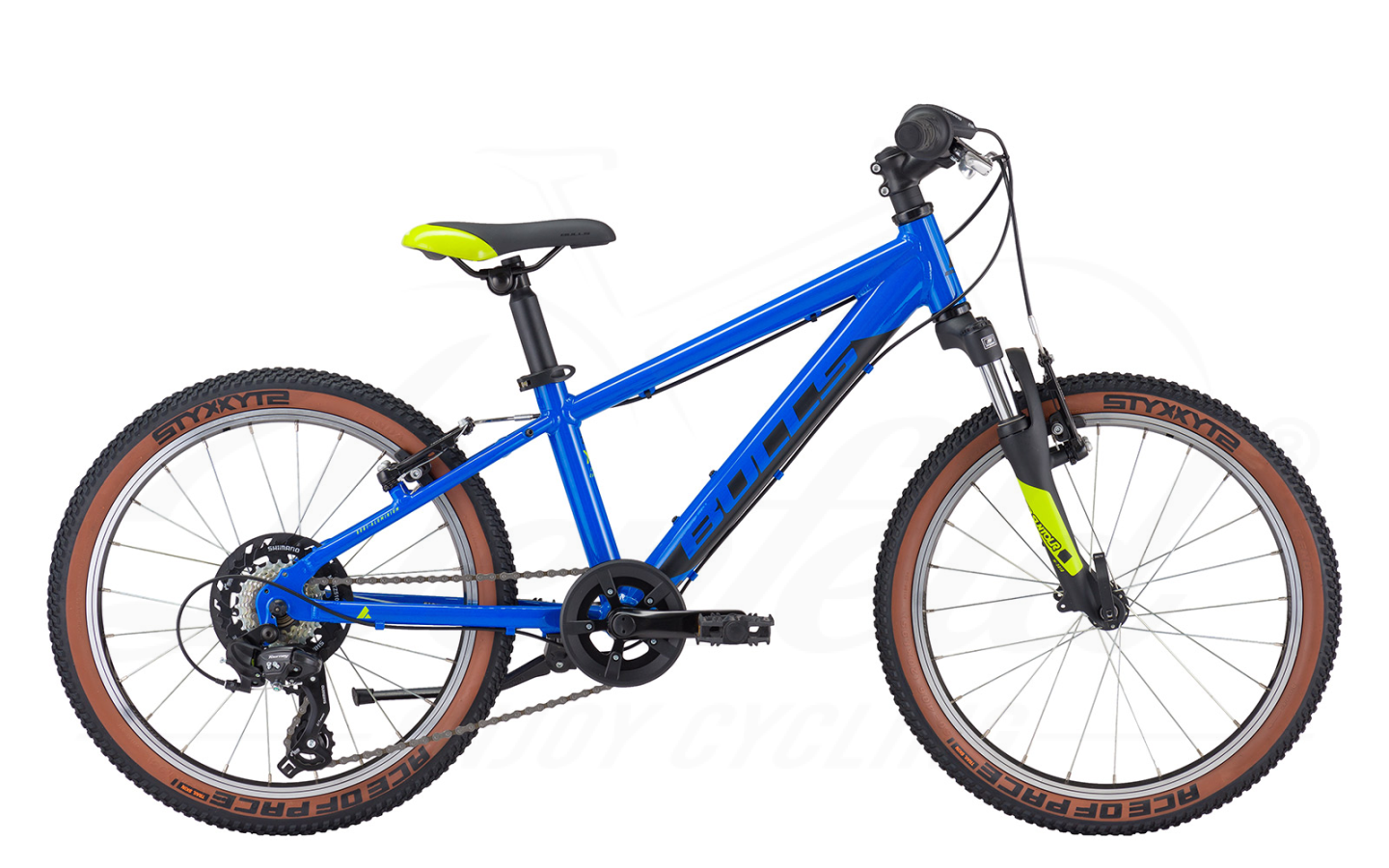 Der Aluminium-Rahmen in sportlicher Diamant-Rahmenform ist besonders hĂŒbsch in coolen Blau mit Neon-Akzenten. Federgabel an der Front, 20 Zoll LaufrĂ€der. Coole, griffige MTB-Reifen dĂŒrfen hier nicht fehlen.