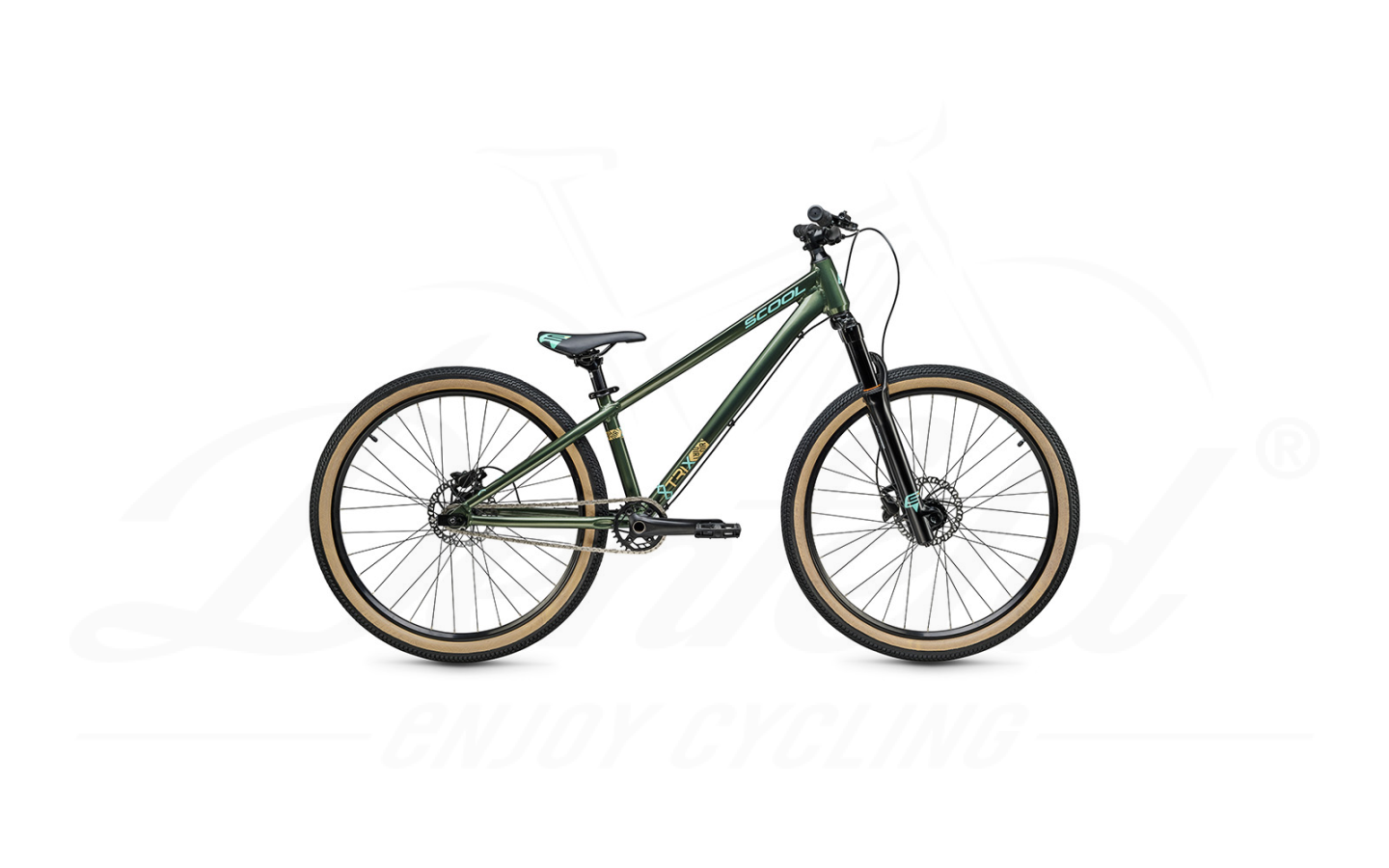 1-Gang mit Freilauf – mehr braucht es zum Dirtbiken nicht. Dazu die 100mm Federgabel an der Front. 26 Zoll Laufräder, deren Skinwall Reifen optisch perfekt dazu passen. Bei all den Jumps und nervenkitzelnden Tricks muss man sich auf eines verlassen kĂśnnen, die Bremse! Genau deshalb kommen hier zuverlässige hydraulische Scheibenbremsen von Shimano ans Bike.